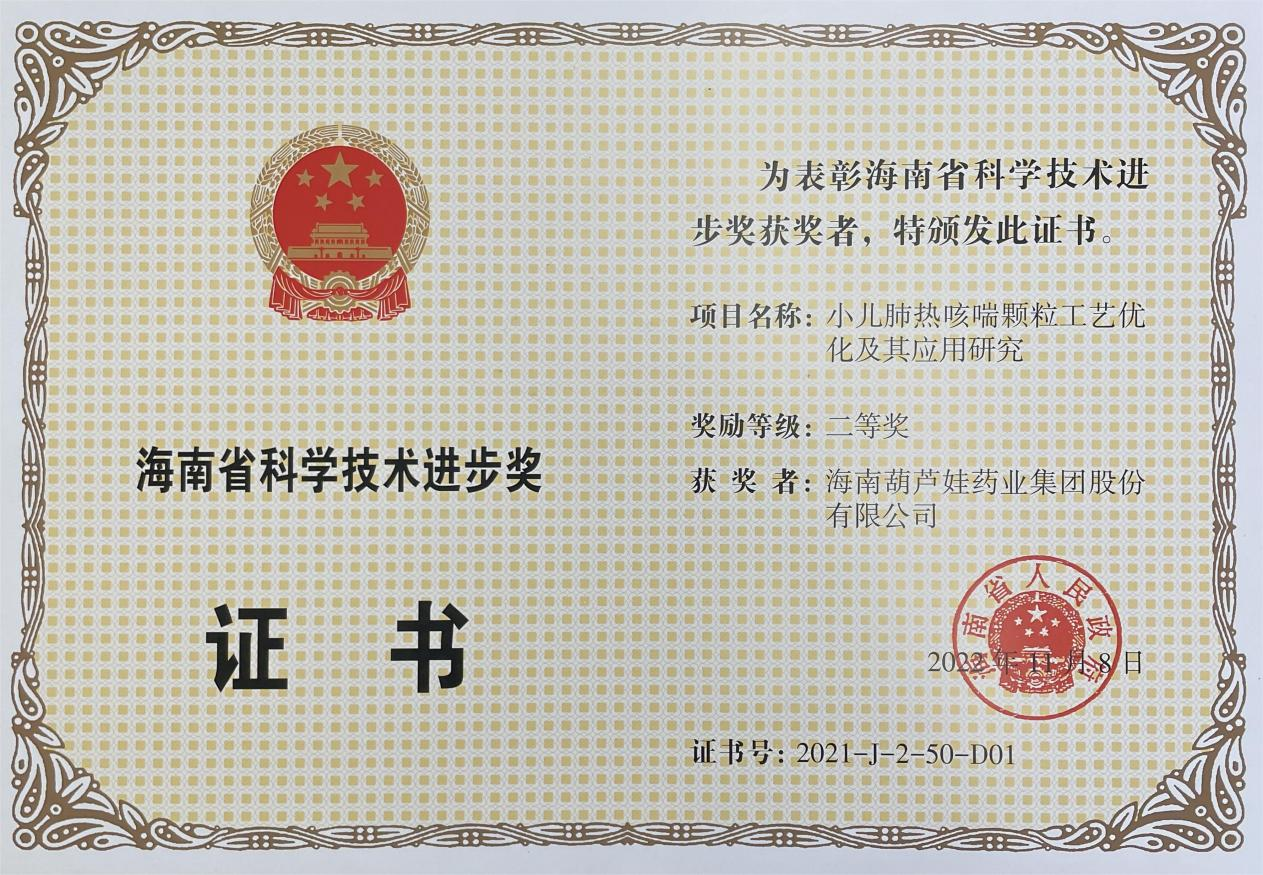 为此,小儿肺热咳喘颗粒的制备方法获得了第二十一届中国专利优秀奖(2019年),专利申请号:ZL201010134951,此次作为专利技术的应用,获得了2021年度海南省科学技术进步奖二等奖。在此之前,918博天娱乐旗舰牌小儿肺热咳喘颗粒还多次被授予“临床价值中成药品牌”、“中国连锁药店最具合作价值单品”,荣登“中国医药品牌榜”。